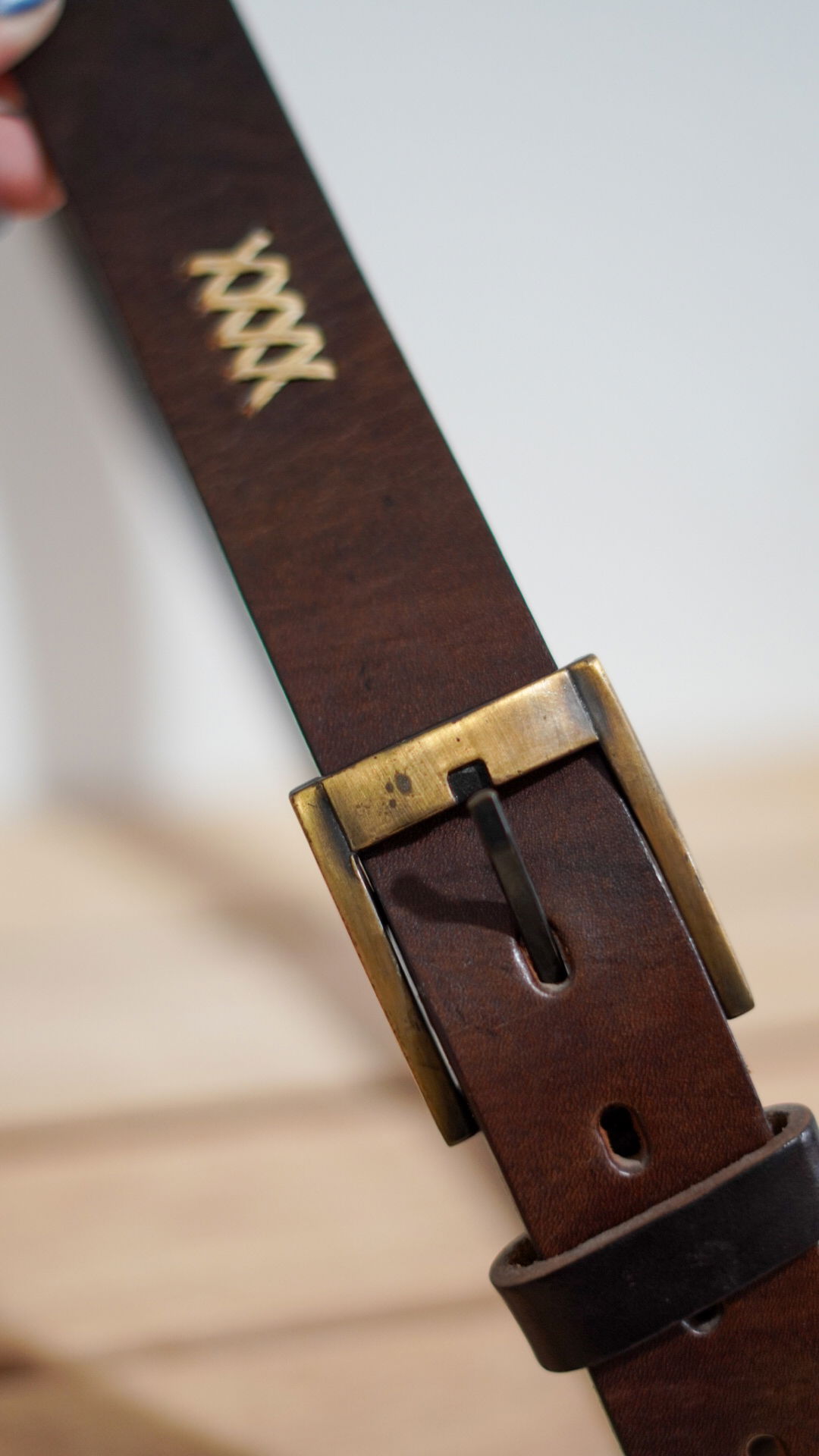 Cuero liso, hebilla de bronce envejecido y detalles bordados.