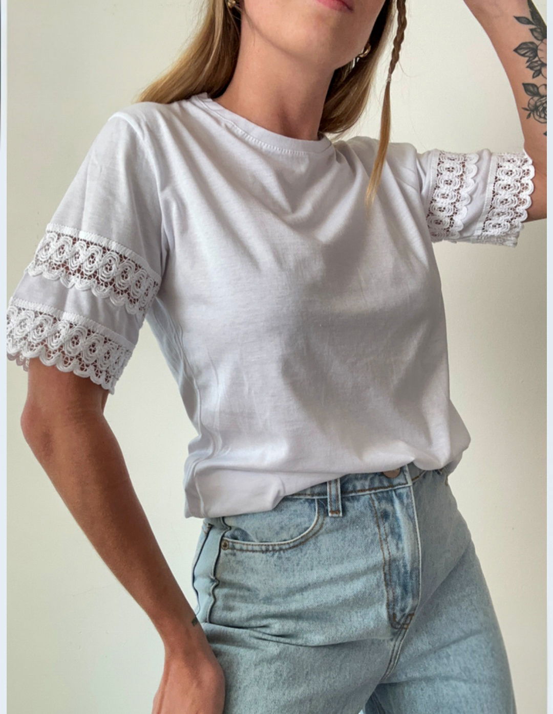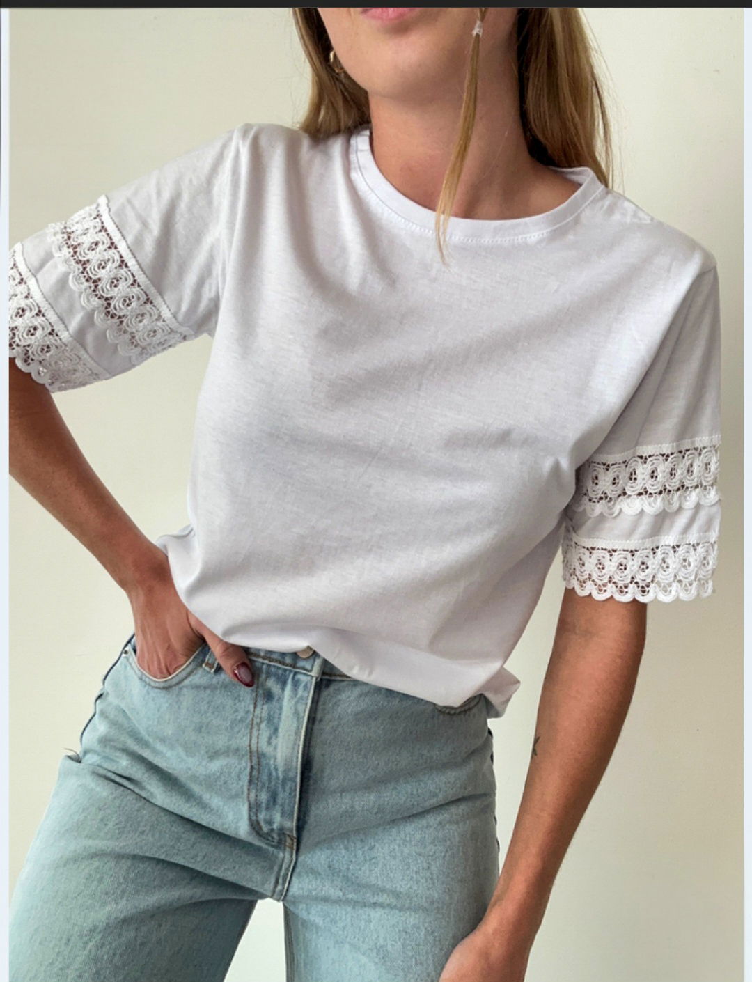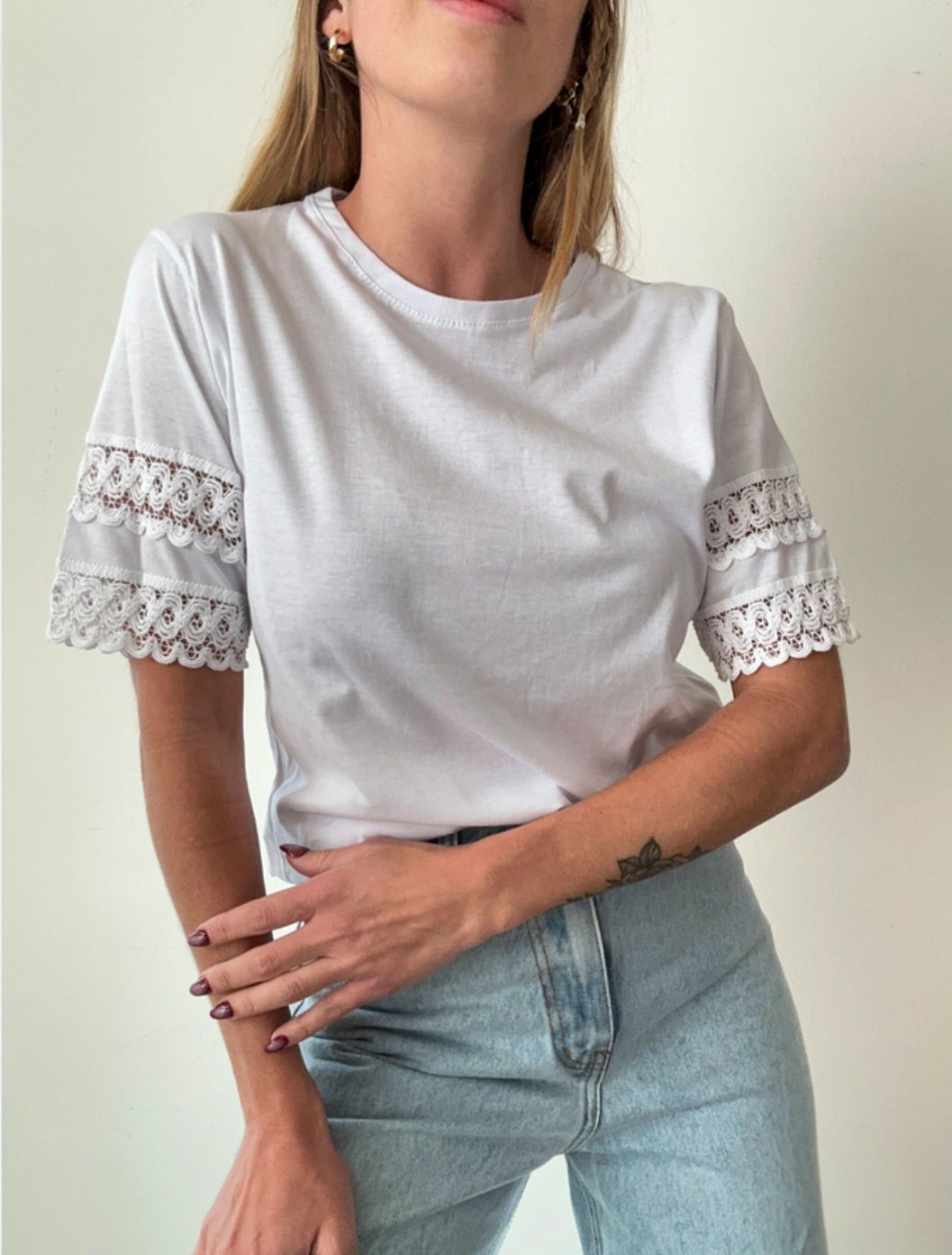 Frente, espalda y manga de algodón 100% premium 24/1 peinado. Mangas con puntilla de algodón. Tapacostura. Espalda entera.